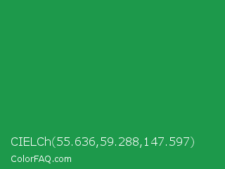 CIELCh 55.636,59.288,147.597 Color is a normal green color and the nearest color is Eucalyptus #278a5b. Hex code #1d994b and RGB value is rgb(29,153,75). In RGB color space, this color is composed of 11% red, 60% green, 29% blue, In CMYK color space, this color is composed of 81% cyan, 0% magenta, 51% yellow , 40% black , In HSL color space, this color has a hue angle of 142° , 68% saturation and 36% lightness.
