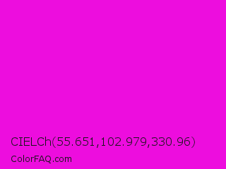 CIELCh 55.651,102.979,330.96 Color is a normal magenta color and the nearest color is Purple Pizzazz #ff00cc. Hex code #ed0dde and RGB value is rgb(237,13,222). In RGB color space, this color is composed of 93% red, 5% green, 87% blue, In CMYK color space, this color is composed of 0% cyan, 95% magenta, 6% yellow , 7% black , In HSL color space, this color has a hue angle of 304° , 90% saturation and 49% lightness.