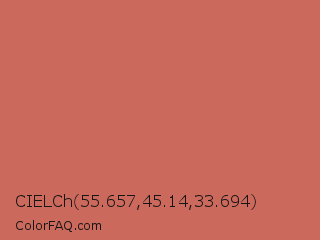 CIELCh 55.657,45.14,33.694 Color is a normal red color and the nearest color is Fuzzy Wuzzy #cc6666. Hex code #cb695c and RGB value is rgb(203,105,92). In RGB color space, this color is composed of 80% red, 41% green, 36% blue, In CMYK color space, this color is composed of 0% cyan, 48% magenta, 55% yellow , 20% black , In HSL color space, this color has a hue angle of 7° , 52% saturation and 58% lightness.