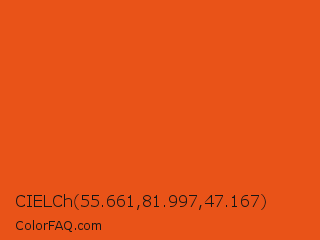 CIELCh 55.661,81.997,47.167 Color is a normal orange color and the nearest color is Flame #e25822. Hex code #e95318 and RGB value is rgb(233,83,24). In RGB color space, this color is composed of 91% red, 33% green, 9% blue, In CMYK color space, this color is composed of 0% cyan, 64% magenta, 90% yellow , 9% black , In HSL color space, this color has a hue angle of 17° , 83% saturation and 50% lightness.