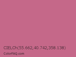 CIELCh 55.662,40.742,358.138 Color is a normal rose color and the nearest color is Cinnamon Satin #cd607e. Hex code #c56889 and RGB value is rgb(197,104,137). In RGB color space, this color is composed of 77% red, 41% green, 54% blue, In CMYK color space, this color is composed of 0% cyan, 47% magenta, 30% yellow , 23% black , In HSL color space, this color has a hue angle of 339° , 44% saturation and 59% lightness.