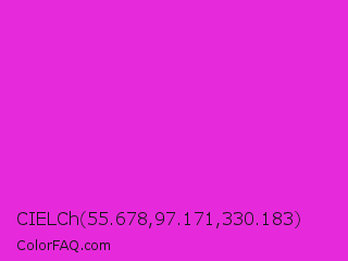 CIELCh 55.678,97.171,330.183 Color is a normal magenta color and the nearest color is Razzle Dazzle Rose #ff33cc. Hex code #e62adb and RGB value is rgb(230,42,219). In RGB color space, this color is composed of 90% red, 16% green, 86% blue, In CMYK color space, this color is composed of 0% cyan, 82% magenta, 5% yellow , 10% black , In HSL color space, this color has a hue angle of 304° , 79% saturation and 53% lightness.