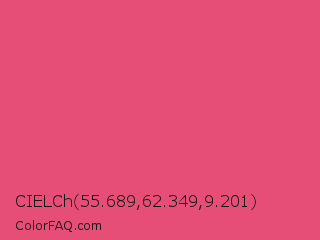 CIELCh 55.689,62.349,9.201 Color is a normal rose color and the nearest color is Dark Pink #e75480. Hex code #e64e77 and RGB value is rgb(230,78,119). In RGB color space, this color is composed of 90% red, 31% green, 47% blue, In CMYK color space, this color is composed of 0% cyan, 66% magenta, 48% yellow , 10% black , In HSL color space, this color has a hue angle of 344° , 75% saturation and 60% lightness.