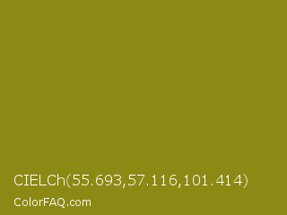 CIELCh 55.693,57.116,101.414 Color is a normal yellow color and the nearest color is Hacienda #98811b. Hex code #8d8915 and RGB value is rgb(141,137,21). In RGB color space, this color is composed of 55% red, 54% green, 8% blue, In CMYK color space, this color is composed of 0% cyan, 3% magenta, 85% yellow , 45% black , In HSL color space, this color has a hue angle of 58° , 74% saturation and 32% lightness.
