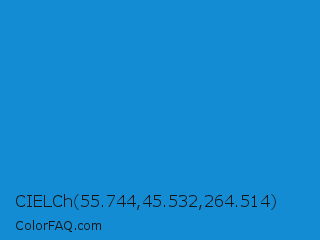 CIELCh 55.744,45.532,264.514 Color is a normal blue color and the nearest color is Rich Electric Blue #0892d0. Hex code #148cd4 and RGB value is rgb(20,140,212). In RGB color space, this color is composed of 8% red, 55% green, 83% blue, In CMYK color space, this color is composed of 91% cyan, 34% magenta, 0% yellow , 17% black , In HSL color space, this color has a hue angle of 203° , 83% saturation and 45% lightness.