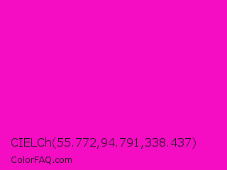 CIELCh 55.772,94.791,338.437 Color is a normal magenta color and the nearest color is Shocking Pink #fc0fc0. Hex code #f50dc4 and RGB value is rgb(245,13,196). In RGB color space, this color is composed of 96% red, 5% green, 77% blue, In CMYK color space, this color is composed of 0% cyan, 95% magenta, 20% yellow , 4% black , In HSL color space, this color has a hue angle of 313° , 92% saturation and 51% lightness.