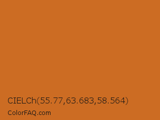 CIELCh 55.77,63.683,58.564 Color is a normal orange color and the nearest color is Hot Cinnamon #d2691e. Hex code #cc6c23 and RGB value is rgb(204,108,35). In RGB color space, this color is composed of 80% red, 42% green, 14% blue, In CMYK color space, this color is composed of 0% cyan, 47% magenta, 83% yellow , 20% black , In HSL color space, this color has a hue angle of 26° , 71% saturation and 47% lightness.