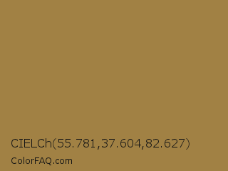 CIELCh 55.781,37.604,82.627 Color is a normal orange color and the nearest color is Metallic Sunburst #9c7c38. Hex code #a18144 and RGB value is rgb(161,129,68). In RGB color space, this color is composed of 63% red, 51% green, 27% blue, In CMYK color space, this color is composed of 0% cyan, 20% magenta, 58% yellow , 37% black , In HSL color space, this color has a hue angle of 39° , 41% saturation and 45% lightness.
