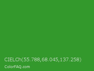 CIELCh 55.788,68.045,137.258 Color is a normal green color and the nearest color is Slimy Green #299617. Hex code #34992d and RGB value is rgb(52,153,45). In RGB color space, this color is composed of 20% red, 60% green, 18% blue, In CMYK color space, this color is composed of 66% cyan, 0% magenta, 71% yellow , 40% black , In HSL color space, this color has a hue angle of 116° , 55% saturation and 39% lightness.