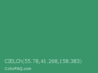 CIELCh 55.78,41.268,158.383 Color is a normal green color and the nearest color is Illuminating Emerald #319177. Hex code #38966a and RGB value is rgb(56,150,106). In RGB color space, this color is composed of 22% red, 59% green, 42% blue, In CMYK color space, this color is composed of 63% cyan, 0% magenta, 29% yellow , 41% black , In HSL color space, this color has a hue angle of 152° , 46% saturation and 40% lightness.
