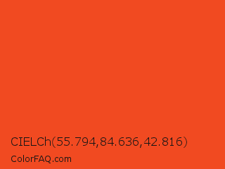 CIELCh 55.794,84.636,42.816 Color is a normal red color and the nearest color is Pomegranate #f34723. Hex code #f14a21 and RGB value is rgb(241,74,33). In RGB color space, this color is composed of 95% red, 29% green, 13% blue, In CMYK color space, this color is composed of 0% cyan, 69% magenta, 86% yellow , 5% black , In HSL color space, this color has a hue angle of 12° , 88% saturation and 54% lightness.