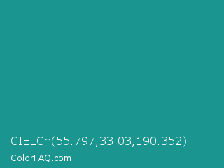 CIELCh 55.797,33.03,190.352 Color is a normal cyan color and the nearest color is Blue Chill #0c8990. Hex code #1b958f and RGB value is rgb(27,149,143). In RGB color space, this color is composed of 11% red, 58% green, 56% blue, In CMYK color space, this color is composed of 82% cyan, 0% magenta, 4% yellow , 42% black , In HSL color space, this color has a hue angle of 177° , 69% saturation and 35% lightness.