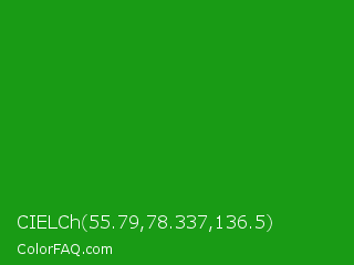 CIELCh 55.79,78.337,136.5 Color is a normal green color and the nearest color is Slimy Green #299617. Hex code #199b15 and RGB value is rgb(25,155,21). In RGB color space, this color is composed of 10% red, 61% green, 8% blue, In CMYK color space, this color is composed of 84% cyan, 0% magenta, 86% yellow , 39% black , In HSL color space, this color has a hue angle of 118° , 76% saturation and 35% lightness.