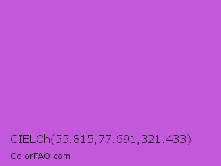 CIELCh 55.815,77.691,321.433 Color is a normal purple color and the nearest color is Medium Orchid #ba55d3. Hex code #c259db and RGB value is rgb(194,89,219). In RGB color space, this color is composed of 76% red, 35% green, 86% blue, In CMYK color space, this color is composed of 11% cyan, 59% magenta, 0% yellow , 14% black , In HSL color space, this color has a hue angle of 288° , 64% saturation and 60% lightness.