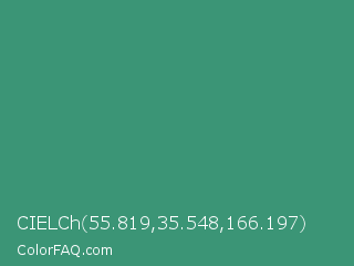 CIELCh 55.819,35.548,166.197 Color is a normal green color and the nearest color is Illuminating Emerald #319177. Hex code #3b9576 and RGB value is rgb(59,149,118). In RGB color space, this color is composed of 23% red, 58% green, 46% blue, In CMYK color space, this color is composed of 60% cyan, 0% magenta, 21% yellow , 42% black , In HSL color space, this color has a hue angle of 159° , 43% saturation and 41% lightness.