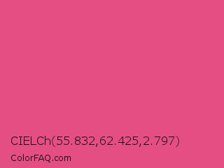 CIELCh 55.832,62.425,2.797 Color is a normal rose color and the nearest color is Dark Pink #e75480. Hex code #e54e83 and RGB value is rgb(229,78,131). In RGB color space, this color is composed of 90% red, 31% green, 51% blue, In CMYK color space, this color is composed of 0% cyan, 66% magenta, 43% yellow , 10% black , In HSL color space, this color has a hue angle of 339° , 74% saturation and 60% lightness.