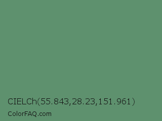 CIELCh 55.843,28.23,151.961 Color is a normal green color and the nearest color is Russian Green #679267. Hex code #5e916e and RGB value is rgb(94,145,110). In RGB color space, this color is composed of 37% red, 57% green, 43% blue, In CMYK color space, this color is composed of 35% cyan, 0% magenta, 24% yellow , 43% black , In HSL color space, this color has a hue angle of 139° , 21% saturation and 47% lightness.