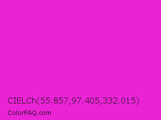 CIELCh 55.857,97.405,332.015 Color is a normal magenta color and the nearest color is Hot Magenta #ff1dce. Hex code #eb23d7 and RGB value is rgb(235,35,215). In RGB color space, this color is composed of 92% red, 14% green, 84% blue, In CMYK color space, this color is composed of 0% cyan, 85% magenta, 9% yellow , 8% black , In HSL color space, this color has a hue angle of 306° , 83% saturation and 53% lightness.