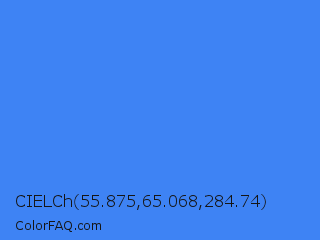 CIELCh 55.875,65.068,284.74 Color is a normal blue color and the nearest color is Blueberry #4f86f7. Hex code #3e83f4 and RGB value is rgb(62,131,244). In RGB color space, this color is composed of 24% red, 51% green, 96% blue, In CMYK color space, this color is composed of 75% cyan, 46% magenta, 0% yellow , 4% black , In HSL color space, this color has a hue angle of 217° , 89% saturation and 60% lightness.