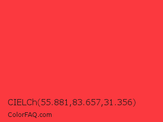 CIELCh 55.881,83.657,31.356 Color is a normal red color and the nearest color is Coral Red #ff4040. Hex code #fb393f and RGB value is rgb(251,57,63). In RGB color space, this color is composed of 98% red, 22% green, 25% blue, In CMYK color space, this color is composed of 0% cyan, 77% magenta, 75% yellow , 2% black , In HSL color space, this color has a hue angle of 358° , 96% saturation and 60% lightness.