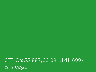 CIELCh 55.887,66.091,141.699 Color is a normal green color and the nearest color is Forest Green #228b22. Hex code #259a39 and RGB value is rgb(37,154,57). In RGB color space, this color is composed of 15% red, 60% green, 22% blue, In CMYK color space, this color is composed of 76% cyan, 0% magenta, 63% yellow , 40% black , In HSL color space, this color has a hue angle of 130° , 61% saturation and 37% lightness.
