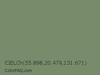 CIELCh 55.898,20.479,131.671 Color is a normal green color and the nearest color is Camouflage Green #78866b. Hex code #788c6b and RGB value is rgb(120,140,107). In RGB color space, this color is composed of 47% red, 55% green, 42% blue, In CMYK color space, this color is composed of 14% cyan, 0% magenta, 24% yellow , 45% black , In HSL color space, this color has a hue angle of 96° , 13% saturation and 48% lightness.