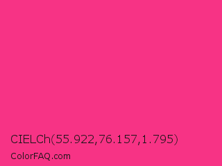 CIELCh 55.922,76.157,1.795 Color is a normal rose color and the nearest color is Cerise Pink #ec3b83. Hex code #f73385 and RGB value is rgb(247,51,133). In RGB color space, this color is composed of 97% red, 20% green, 52% blue, In CMYK color space, this color is composed of 0% cyan, 79% magenta, 46% yellow , 3% black , In HSL color space, this color has a hue angle of 335° , 92% saturation and 58% lightness.