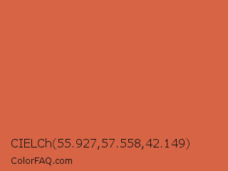 CIELCh 55.927,57.558,42.149 Color is a normal red color and the nearest color is Red Damask #da6a41. Hex code #d66445 and RGB value is rgb(214,100,69). In RGB color space, this color is composed of 84% red, 39% green, 27% blue, In CMYK color space, this color is composed of 0% cyan, 53% magenta, 68% yellow , 16% black , In HSL color space, this color has a hue angle of 13° , 64% saturation and 55% lightness.