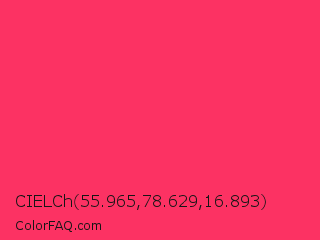 CIELCh 55.965,78.629,16.893 Color is a normal red color and the nearest color is Radical Red #ff355e. Hex code #fc3263 and RGB value is rgb(252,50,99). In RGB color space, this color is composed of 99% red, 20% green, 39% blue, In CMYK color space, this color is composed of 0% cyan, 80% magenta, 61% yellow , 1% black , In HSL color space, this color has a hue angle of 345° , 97% saturation and 59% lightness.