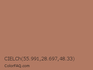 CIELCh 55.991,28.697,48.33 Color is a normal orange color and the nearest color is Copper Penny #ad6f69. Hex code #b17962 and RGB value is rgb(177,121,98). In RGB color space, this color is composed of 69% red, 47% green, 38% blue, In CMYK color space, this color is composed of 0% cyan, 32% magenta, 45% yellow , 31% black , In HSL color space, this color has a hue angle of 17° , 34% saturation and 54% lightness.