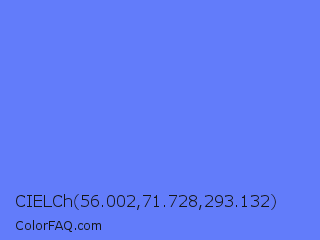 CIELCh 56.002,71.728,293.132 Color is a light blue color and the nearest color is Blueberry #4f86f7. Hex code #627cfa and RGB value is rgb(98,124,250). In RGB color space, this color is composed of 38% red, 49% green, 98% blue, In CMYK color space, this color is composed of 61% cyan, 50% magenta, 0% yellow , 2% black , In HSL color space, this color has a hue angle of 230° , 94% saturation and 68% lightness.