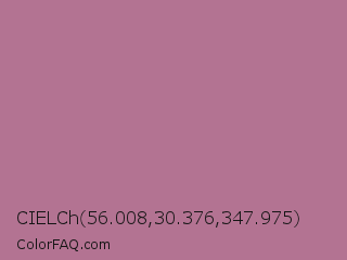 CIELCh 56.008,30.376,347.975 Color is a normal rose color and the nearest color is English Lavender #b48395. Hex code #b37392 and RGB value is rgb(179,115,146). In RGB color space, this color is composed of 70% red, 45% green, 57% blue, In CMYK color space, this color is composed of 0% cyan, 36% magenta, 18% yellow , 30% black , In HSL color space, this color has a hue angle of 331° , 30% saturation and 58% lightness.