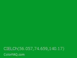 CIELCh 56.057,74.659,140.17 Color is a normal green color and the nearest color is North Texas Green #059033. Hex code #059c29 and RGB value is rgb(5,156,41). In RGB color space, this color is composed of 2% red, 61% green, 16% blue, In CMYK color space, this color is composed of 97% cyan, 0% magenta, 74% yellow , 39% black , In HSL color space, this color has a hue angle of 134° , 94% saturation and 32% lightness.