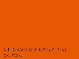 CIELCh 56.062,83.314,51.475 Color is a normal orange color and the nearest color is Persimmon #ec5800. Hex code #e65903 and RGB value is rgb(230,89,3). In RGB color space, this color is composed of 90% red, 35% green, 1% blue, In CMYK color space, this color is composed of 0% cyan, 61% magenta, 99% yellow , 10% black , In HSL color space, this color has a hue angle of 23° , 97% saturation and 46% lightness.