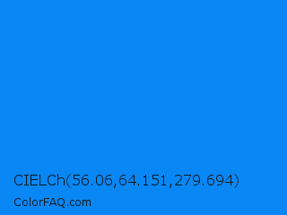 CIELCh 56.06,64.151,279.694 Color is a normal blue color and the nearest color is Azure Radiance #007fff. Hex code #0887f5 and RGB value is rgb(8,135,245). In RGB color space, this color is composed of 3% red, 53% green, 96% blue, In CMYK color space, this color is composed of 97% cyan, 45% magenta, 0% yellow , 4% black , In HSL color space, this color has a hue angle of 208° , 94% saturation and 50% lightness.