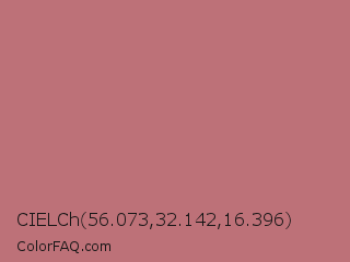 CIELCh 56.073,32.142,16.396 Color is a normal red color and the nearest color is Rose Gold #b76e79. Hex code #bd7178 and RGB value is rgb(189,113,120). In RGB color space, this color is composed of 74% red, 44% green, 47% blue, In CMYK color space, this color is composed of 0% cyan, 40% magenta, 37% yellow , 26% black , In HSL color space, this color has a hue angle of 354° , 37% saturation and 59% lightness.