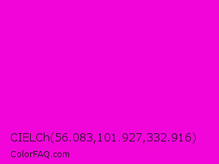 CIELCh 56.083,101.927,332.916 Color is a normal magenta color and the nearest color is Purple Pizzazz #ff00cc. Hex code #f205d9 and RGB value is rgb(242,5,217). In RGB color space, this color is composed of 95% red, 2% green, 85% blue, In CMYK color space, this color is composed of 0% cyan, 98% magenta, 10% yellow , 5% black , In HSL color space, this color has a hue angle of 306° , 96% saturation and 48% lightness.