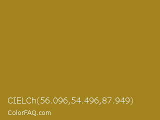 CIELCh 56.096,54.496,87.949 Color is a normal yellow color and the nearest color is Reef Gold #9f821c. Hex code #a2831e and RGB value is rgb(162,131,30). In RGB color space, this color is composed of 64% red, 51% green, 12% blue, In CMYK color space, this color is composed of 0% cyan, 19% magenta, 81% yellow , 36% black , In HSL color space, this color has a hue angle of 46° , 69% saturation and 38% lightness.