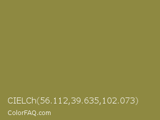 CIELCh 56.112,39.635,102.073 Color is a normal yellow color and the nearest color is Sycamore #908d39. Hex code #8e8941 and RGB value is rgb(142,137,65). In RGB color space, this color is composed of 56% red, 54% green, 25% blue, In CMYK color space, this color is composed of 0% cyan, 4% magenta, 54% yellow , 44% black , In HSL color space, this color has a hue angle of 56° , 37% saturation and 41% lightness.