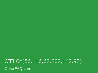 CIELCh 56.116,62.202,142.97 Color is a normal green color and the nearest color is Sea Green #2e8b57. Hex code #2c9a41 and RGB value is rgb(44,154,65). In RGB color space, this color is composed of 17% red, 60% green, 25% blue, In CMYK color space, this color is composed of 71% cyan, 0% magenta, 58% yellow , 40% black , In HSL color space, this color has a hue angle of 131° , 56% saturation and 39% lightness.