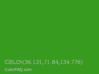 CIELCh 56.121,71.84,134.776 Color is a normal green color and the nearest color is Slimy Green #299617. Hex code #379a21 and RGB value is rgb(55,154,33). In RGB color space, this color is composed of 22% red, 60% green, 13% blue, In CMYK color space, this color is composed of 64% cyan, 0% magenta, 79% yellow , 40% black , In HSL color space, this color has a hue angle of 109° , 65% saturation and 37% lightness.