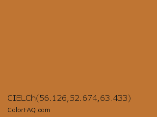 CIELCh 56.126,52.674,63.433 Color is a normal orange color and the nearest color is Copper #b87333. Hex code #bf7533 and RGB value is rgb(191,117,51). In RGB color space, this color is composed of 75% red, 46% green, 20% blue, In CMYK color space, this color is composed of 0% cyan, 39% magenta, 73% yellow , 25% black , In HSL color space, this color has a hue angle of 28° , 58% saturation and 47% lightness.