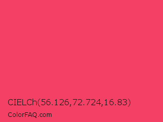 CIELCh 56.126,72.724,16.83 Color is a light red color and the nearest color is Neon Fuchsia #fe4164. Hex code #f54066 and RGB value is rgb(245,64,102). In RGB color space, this color is composed of 96% red, 25% green, 40% blue, In CMYK color space, this color is composed of 0% cyan, 74% magenta, 58% yellow , 4% black , In HSL color space, this color has a hue angle of 347° , 90% saturation and 61% lightness.