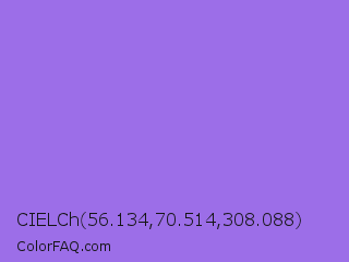 CIELCh 56.134,70.514,308.088 Color is a light violet color and the nearest color is Medium Purple #9370db. Hex code #9c6ee8 and RGB value is rgb(156,110,232). In RGB color space, this color is composed of 61% red, 43% green, 91% blue, In CMYK color space, this color is composed of 33% cyan, 53% magenta, 0% yellow , 9% black , In HSL color space, this color has a hue angle of 263° , 73% saturation and 67% lightness.