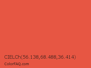 CIELCh 56.138,68.488,36.414 Color is a normal red color and the nearest color is Carmine Pink #eb4c42. Hex code #e75643 and RGB value is rgb(231,86,67). In RGB color space, this color is composed of 91% red, 34% green, 26% blue, In CMYK color space, this color is composed of 0% cyan, 63% magenta, 71% yellow , 9% black , In HSL color space, this color has a hue angle of 7° , 77% saturation and 58% lightness.