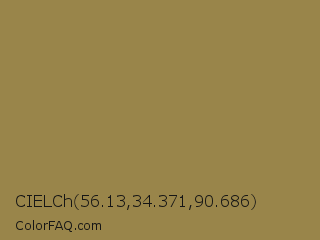 CIELCh 56.13,34.371,90.686 Color is a normal orange color and the nearest color is Dark Tan #918151. Hex code #99854a and RGB value is rgb(153,133,74). In RGB color space, this color is composed of 60% red, 52% green, 29% blue, In CMYK color space, this color is composed of 0% cyan, 13% magenta, 52% yellow , 40% black , In HSL color space, this color has a hue angle of 45° , 35% saturation and 45% lightness.