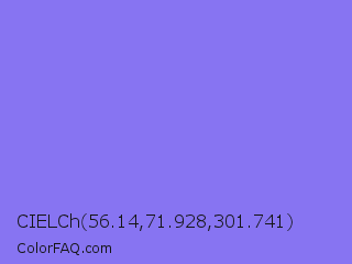 CIELCh 56.14,71.928,301.741 Color is a light indigo color and the nearest color is Medium Slate Blue #7b68ee. Hex code #8774f2 and RGB value is rgb(135,116,242). In RGB color space, this color is composed of 53% red, 45% green, 95% blue, In CMYK color space, this color is composed of 44% cyan, 52% magenta, 0% yellow , 5% black , In HSL color space, this color has a hue angle of 249° , 83% saturation and 70% lightness.
