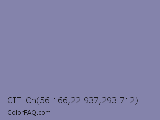 CIELCh 56.166,22.937,293.712 Color is a normal indigo color and the nearest color is Shadow Blue #778ba5. Hex code #8483ab and RGB value is rgb(132,131,171). In RGB color space, this color is composed of 52% red, 51% green, 67% blue, In CMYK color space, this color is composed of 23% cyan, 23% magenta, 0% yellow , 33% black , In HSL color space, this color has a hue angle of 242° , 19% saturation and 59% lightness.