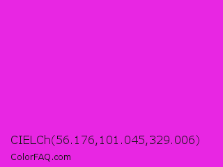 CIELCh 56.176,101.045,329.006 Color is a normal magenta color and the nearest color is Hot Magenta #ff1dce. Hex code #e826e3 and RGB value is rgb(232,38,227). In RGB color space, this color is composed of 91% red, 15% green, 89% blue, In CMYK color space, this color is composed of 0% cyan, 84% magenta, 2% yellow , 9% black , In HSL color space, this color has a hue angle of 302° , 81% saturation and 53% lightness.