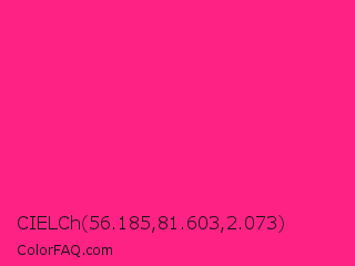 CIELCh 56.185,81.603,2.073 Color is a normal rose color and the nearest color is Fluorescent Pink #ff1493. Hex code #ff2285 and RGB value is rgb(255,34,133). In RGB color space, this color is composed of 100% red, 13% green, 52% blue, In CMYK color space, this color is composed of 0% cyan, 87% magenta, 48% yellow , 0% black , In HSL color space, this color has a hue angle of 333° , 100% saturation and 57% lightness.